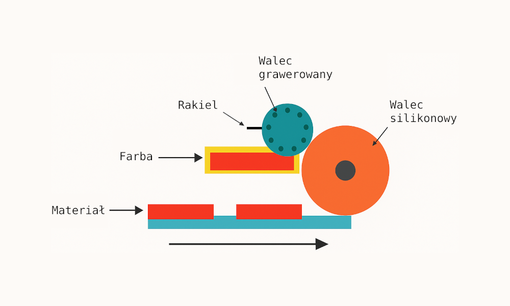 - Proces pośredni: Obraz jest najpierw przenoszony z grawerowanego cylindra wklęsłodrukowego na silikonowy walec pośredni, a następnie na podłoże. Dzięki temu możliwe jest uzyskanie bardzo precyzyjnego nadruku na różnorodnych materiałach.