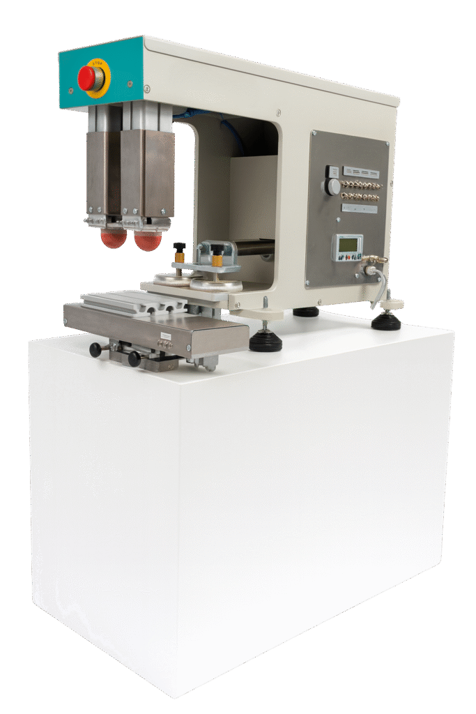 Półautomat stołowy do druku tamponowego w dwóch kolorach z zamkniętymi systemami farbowymi, które minimalizują parowanie substancji lotnych, zapewniając przez to stałość parametrów farby i zmniejszając zagrożenia środowiskowe.