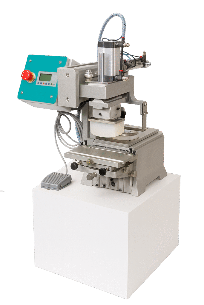 Stołowy półautomat do druku tamponowego w 1 kolorze z zamkniętym systemem farbowym. Minimalizuje on parowanie substancji lotnych, zapewniając przez to stałość parametrów farby i zmniejsza zagrożenia środowiskowe.