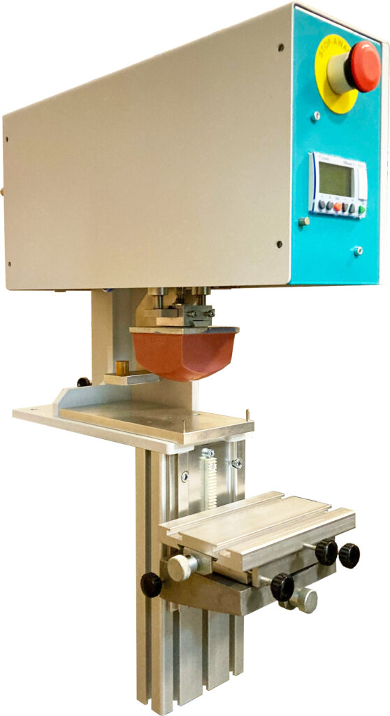 Półautomat do druku tamponowego w 1 kolorze z zamkniętym systemem farbowym fi 90 mm, który minimalizuje parowanie substancji lotnych, zapewniając przez to stałość parametrów farby i zmniejszając zagrożenia środowiskowe.