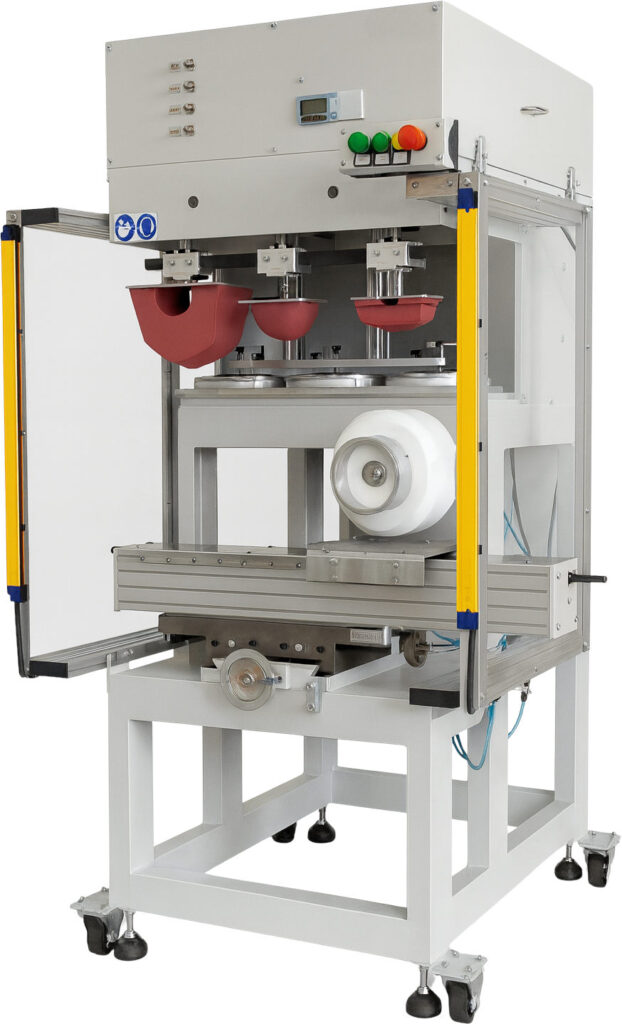 Półautomat do druku tamponowego z trzema zamkniętymi systemami farbowymi, z ceramicznymi pierścieniami zgarniającymi (pierścienie mają dwa ostrza wymienne w razie uszkodzenia), z wielofunkcyjnym układem sterowania (regulacja skoku tamponu na formę i na detal, 1-3 kolorów druku, cykl pojedynczy, podwójny, przerwy technologiczne), z dużą siłą docisku tamponów.